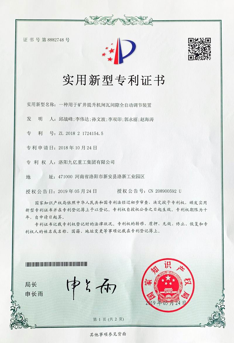 閘瓦間隙全自動(dòng)調(diào)節(jié)裝置證書(shū)